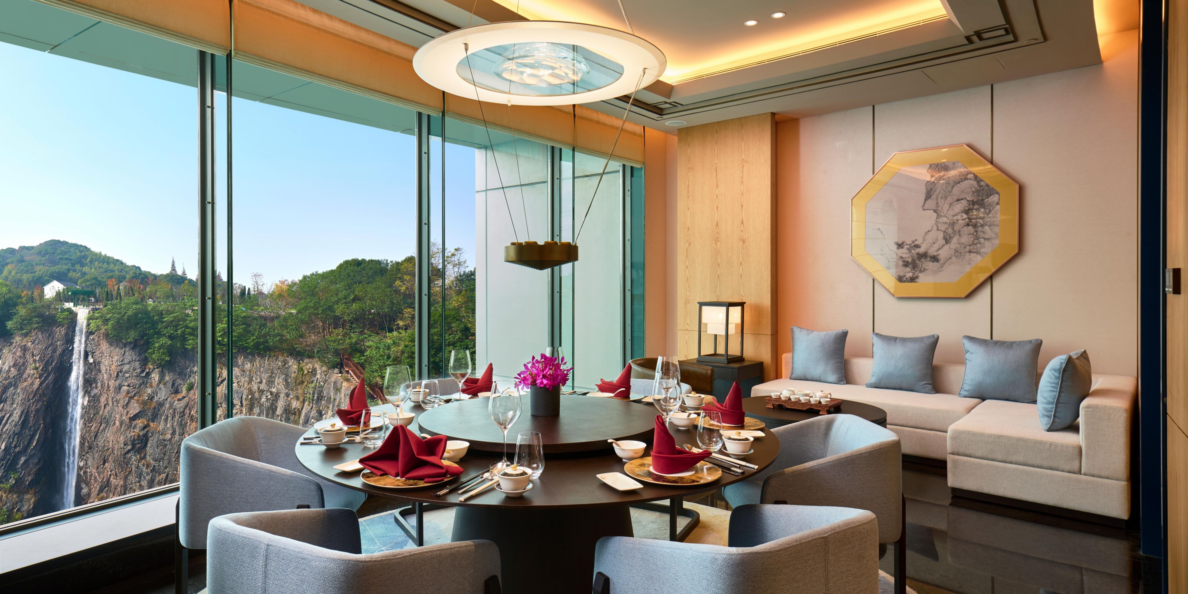 在大堂吧,可尽情饱览佘山国家风景区和天马山深坑交相辉映的美景。伴随着怡人的乐曲,品味精致的特调咖啡、山区种植的特色茶、英式茶饮、鸡尾酒,及特色小吃,将别有一番意境。