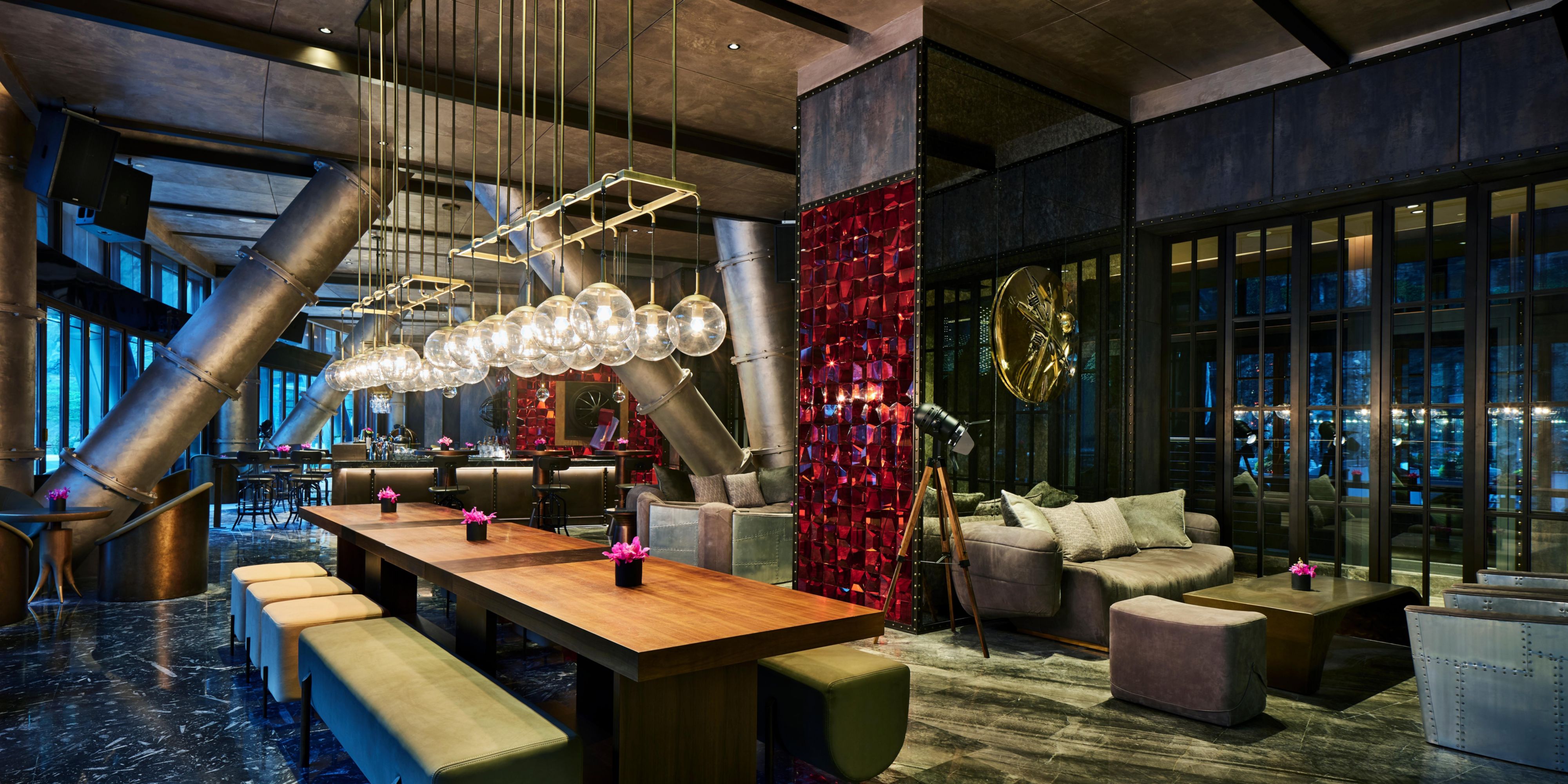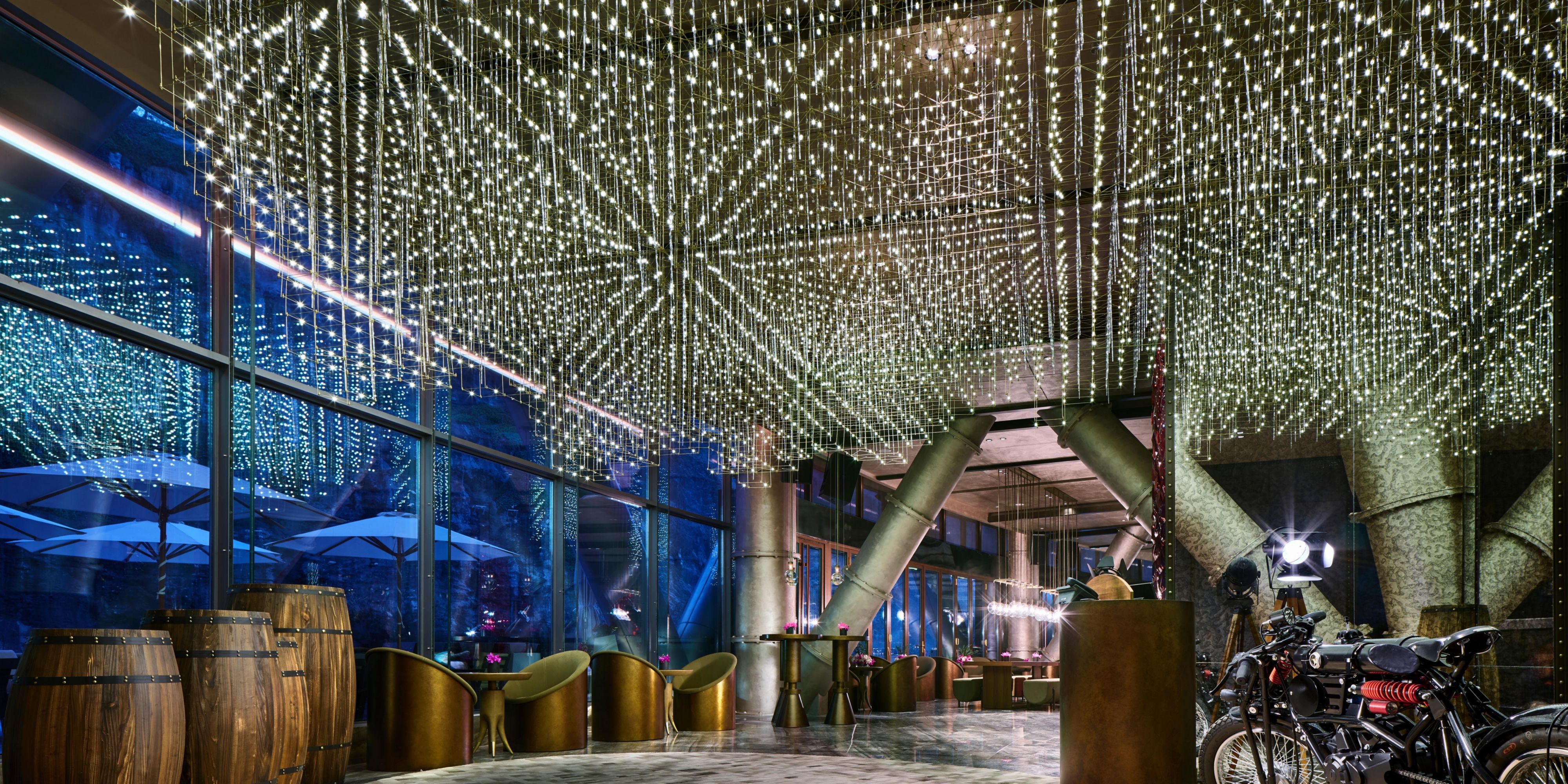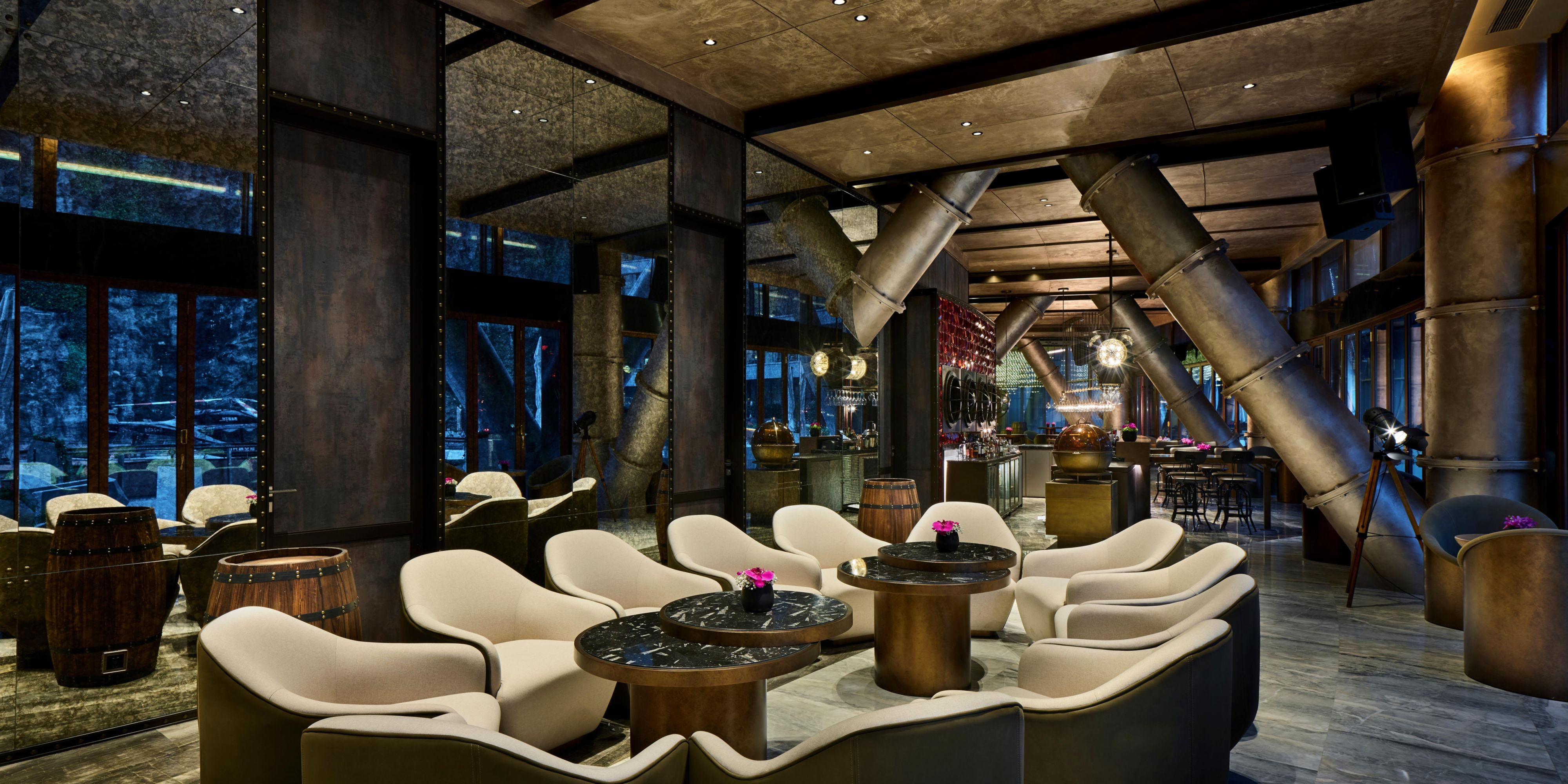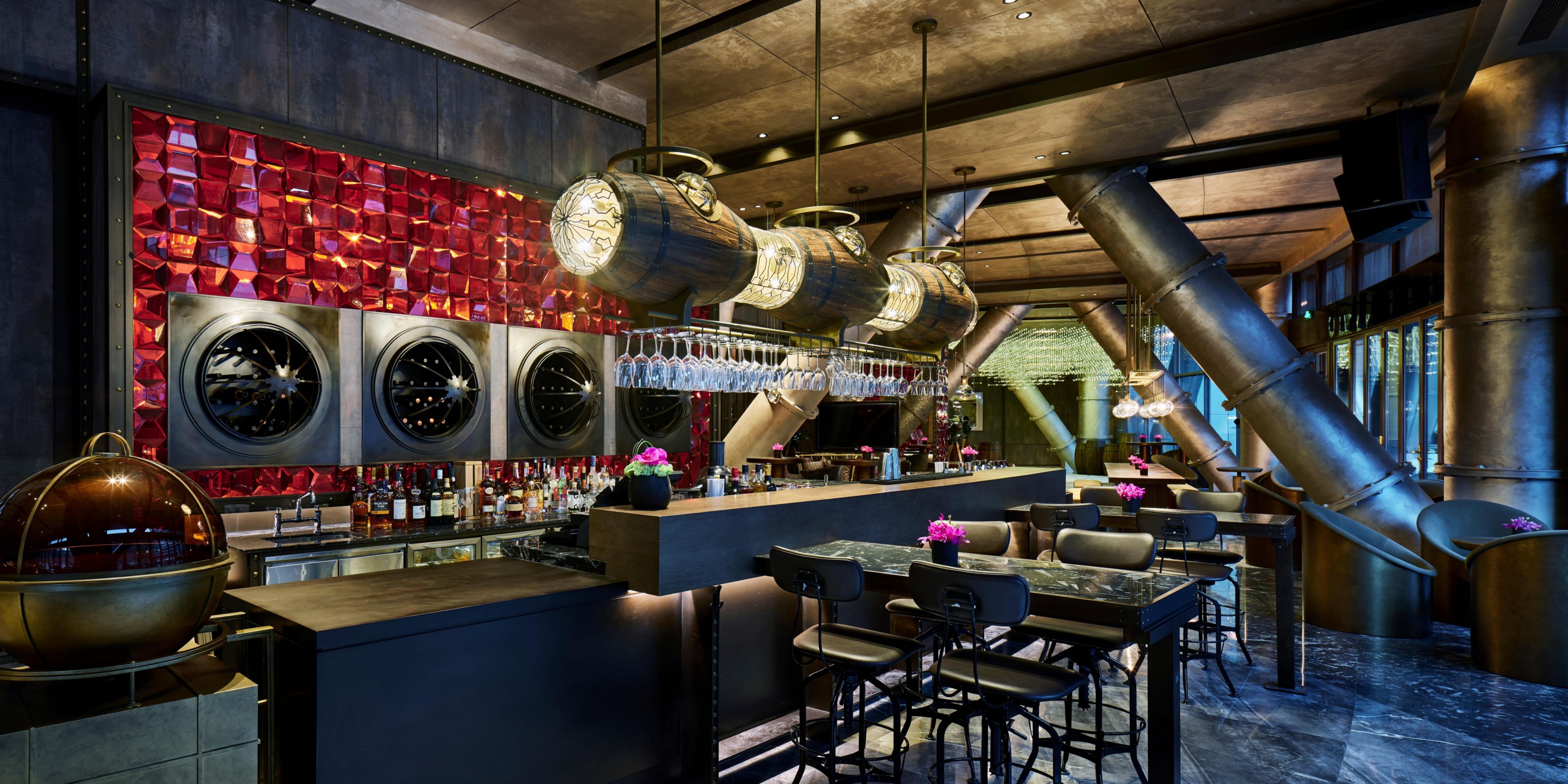 赤酒吧位于坑底与水面之间,就像地心的熔岩层,火红的岩浆散发着炽热的气息。酒吧内部光影结合,让人联想到深坑崖壁内的岩石以及昏暗光线下的矿坑。粗硬的钢结构水管、红色水晶立面、红色皮革、定制木桶酒架⋯⋯这些元泰使酒吧的矿洞工业风愈发浓郁。