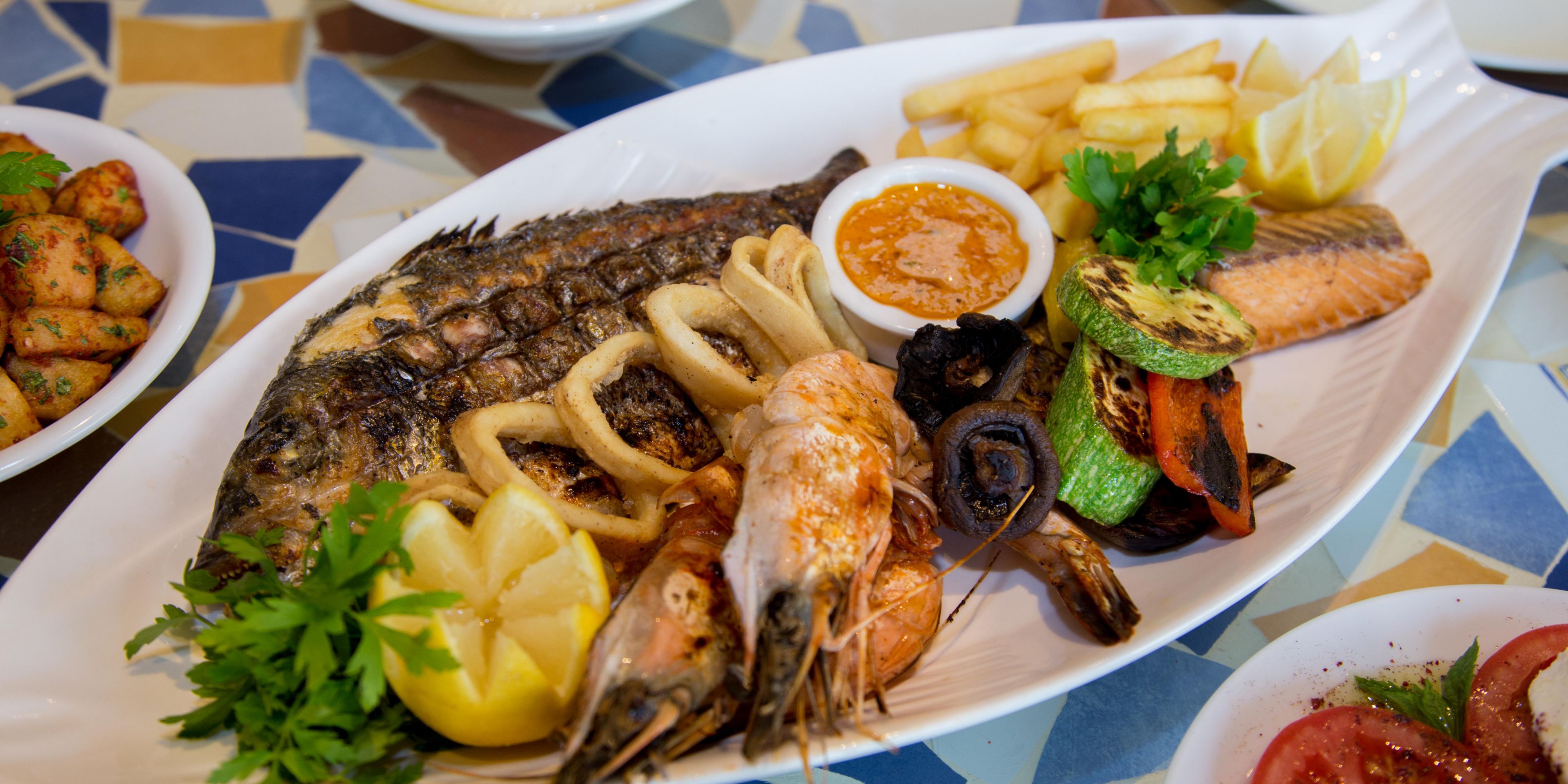 Tender grilled lamb, sticky desserts and all the colours and flavours of authentic mezze and fresh out of the sea seafood selection are on the menu at this famed Lebanese cuisine. Start your banquet with flatbreads warm from the oven and classic dips like hummus. You can dine inside amid colorful mosaic columns or on the terrace with sea and garden views.