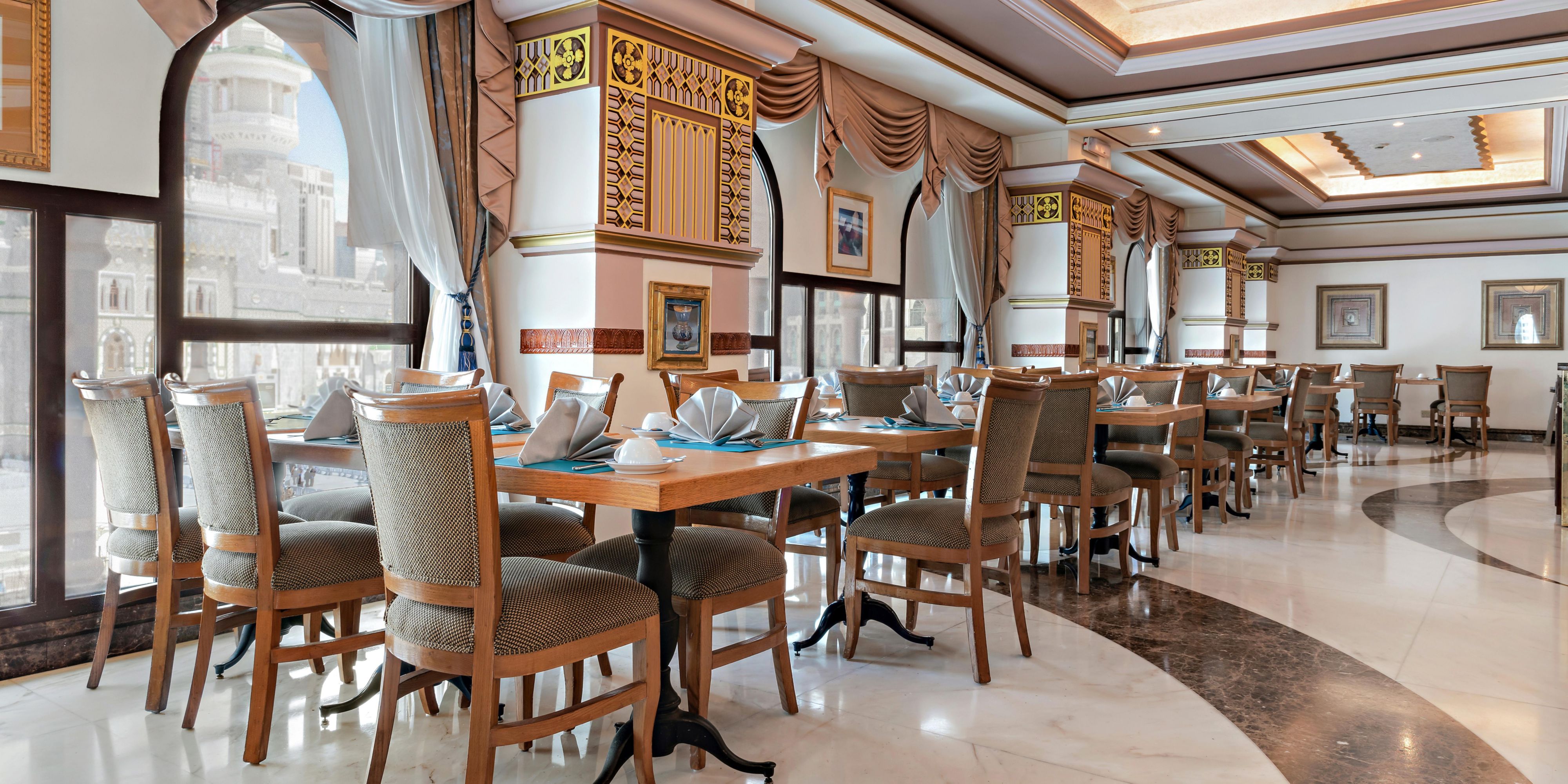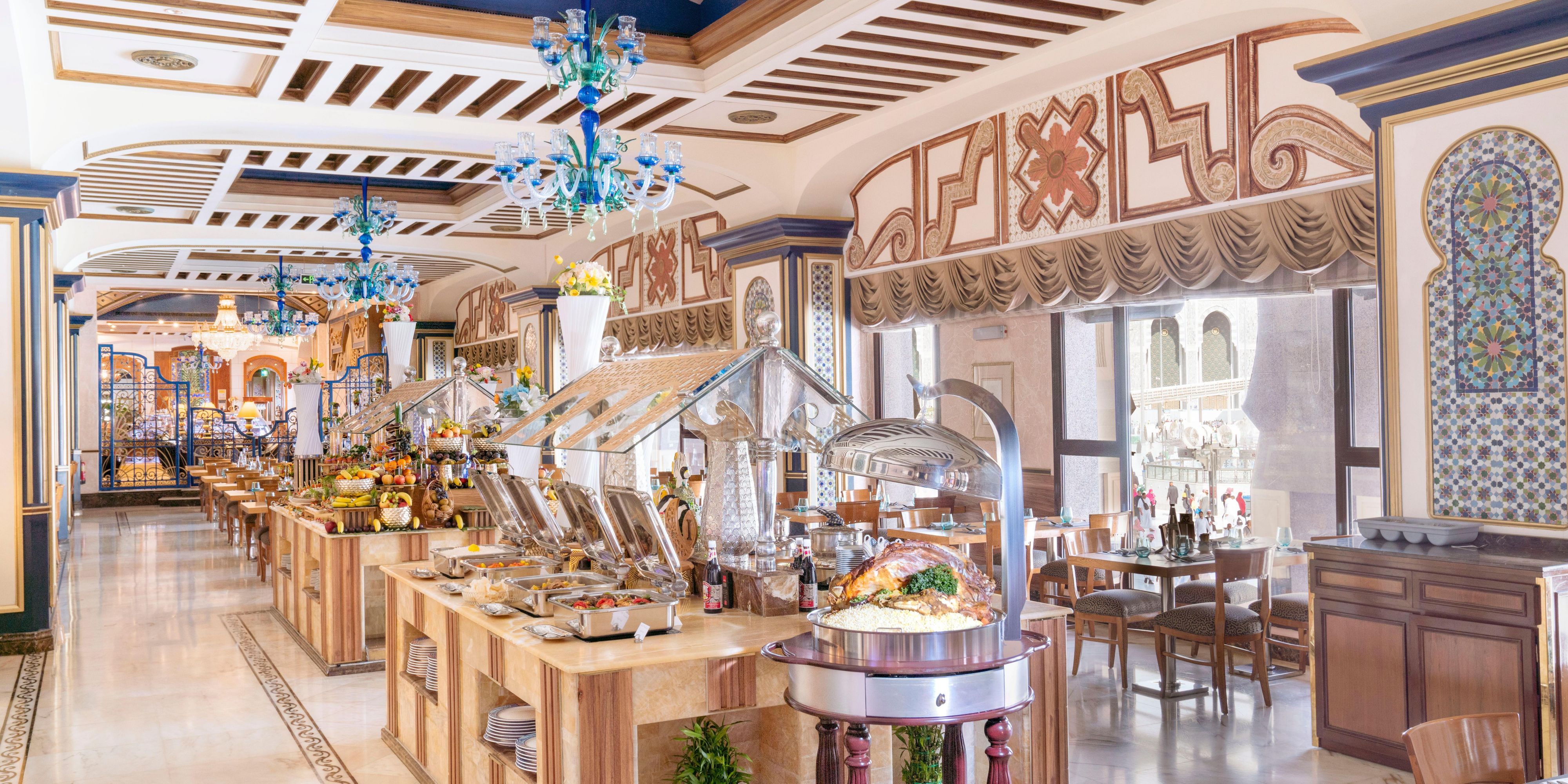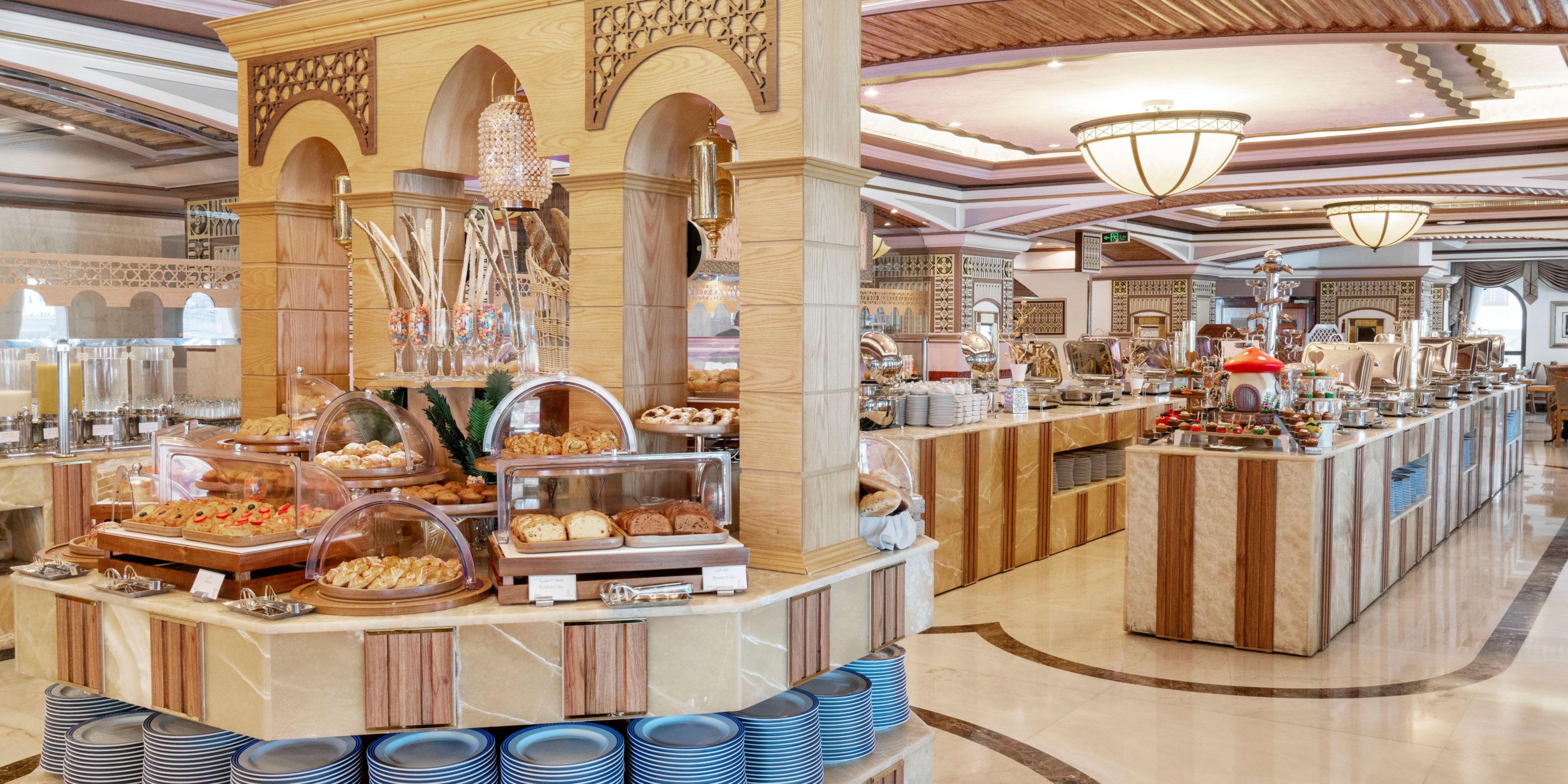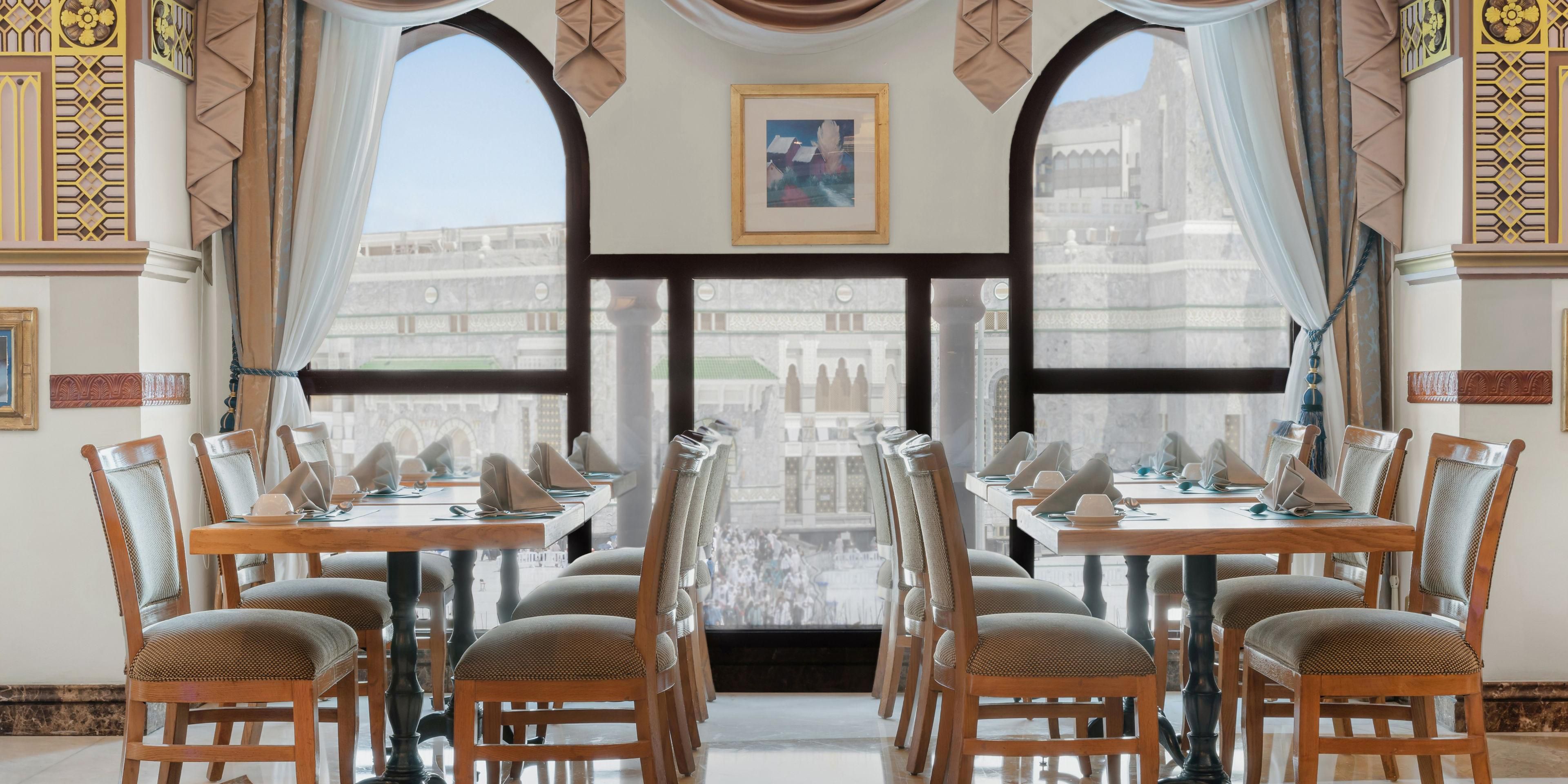 Succumb to a symphony of flavours at Al Tayebat Restaurant, where you can enjoy a sumptuous buffet breakfast within a refined dining room gleaming with gold accents, marble floors and stunning views of the Holy Mosque. At peak periods, we also offer a delicious international lunch and dinner buffet.