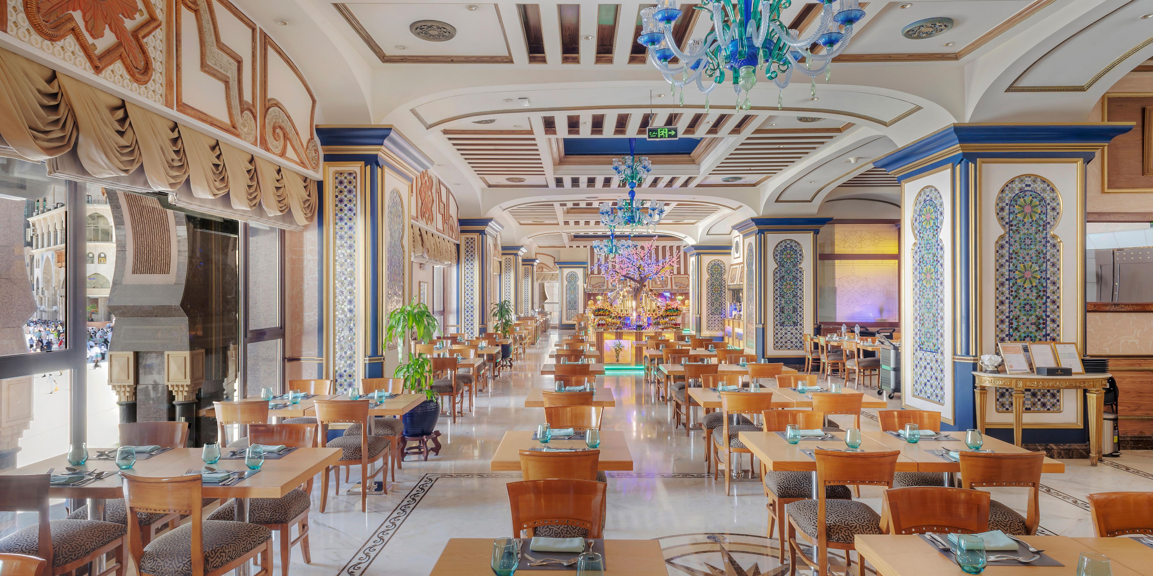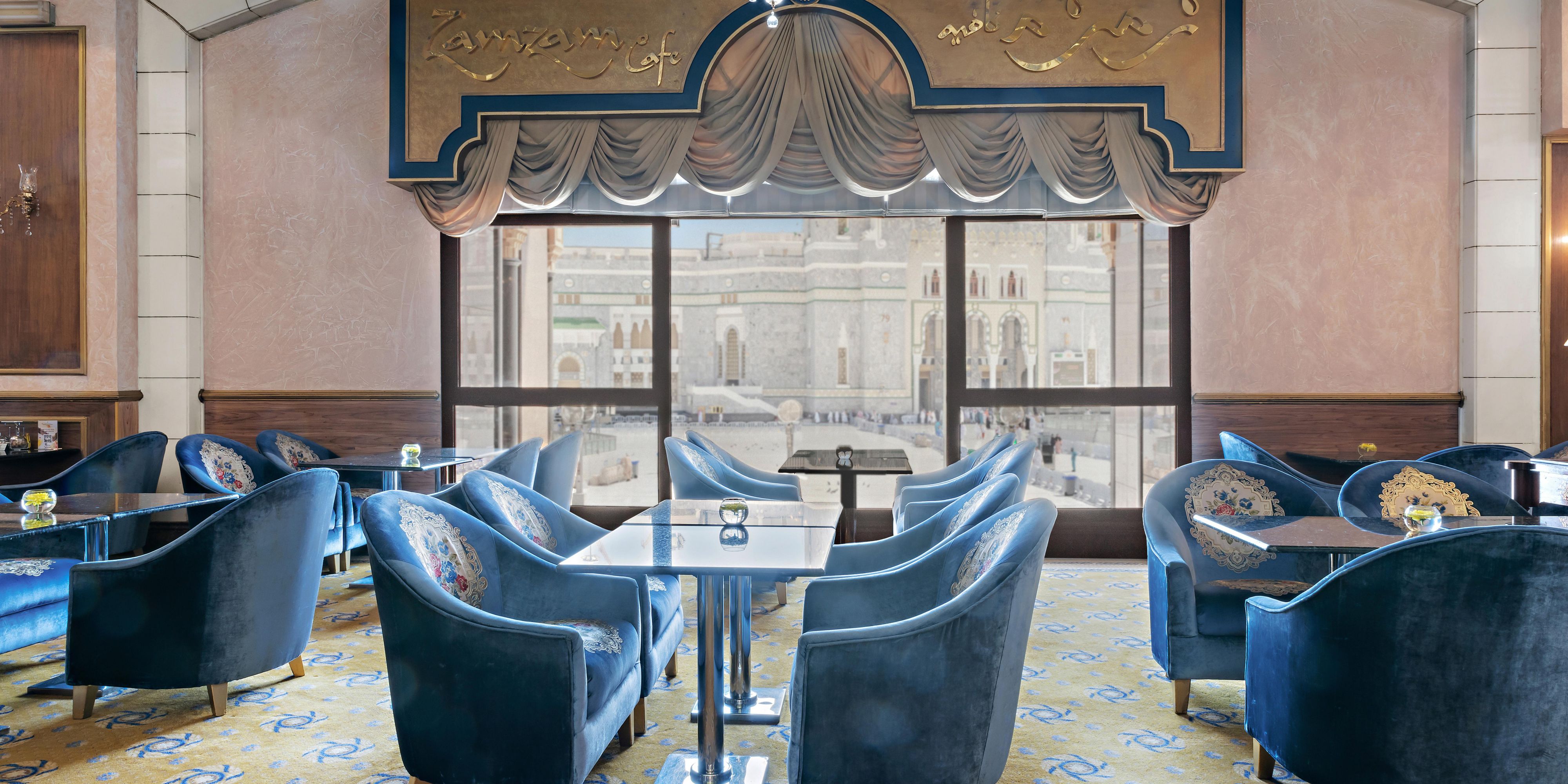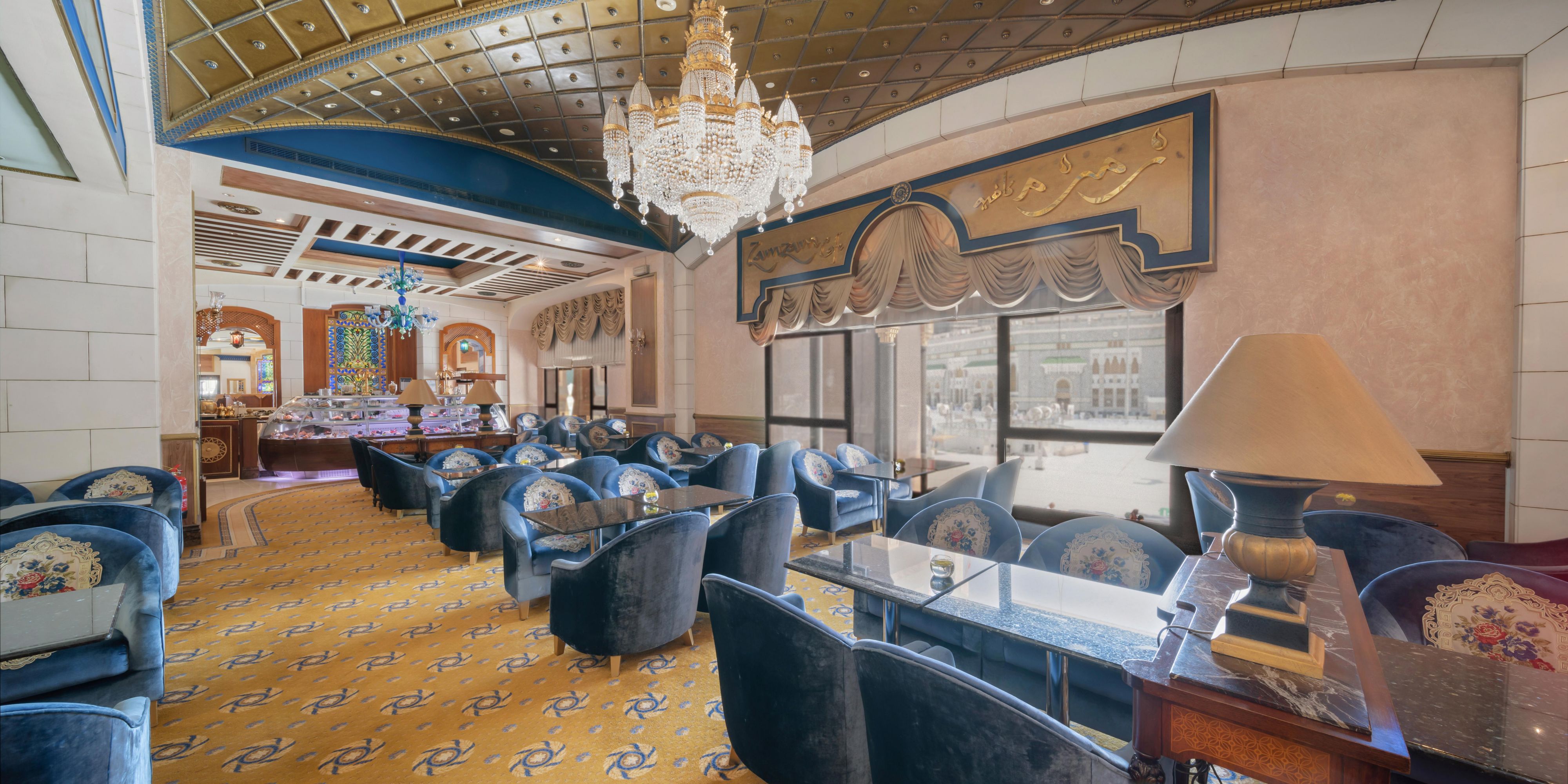 Adorned with chandeliers and showcasing spectacular Holy Mosque views, Zamzam Café is a feast for the senses. Tuck into delicious snacks, including tempting cakes and French pastries, while sipping from a selection of refreshing cold beverages, fine teas and coffees.