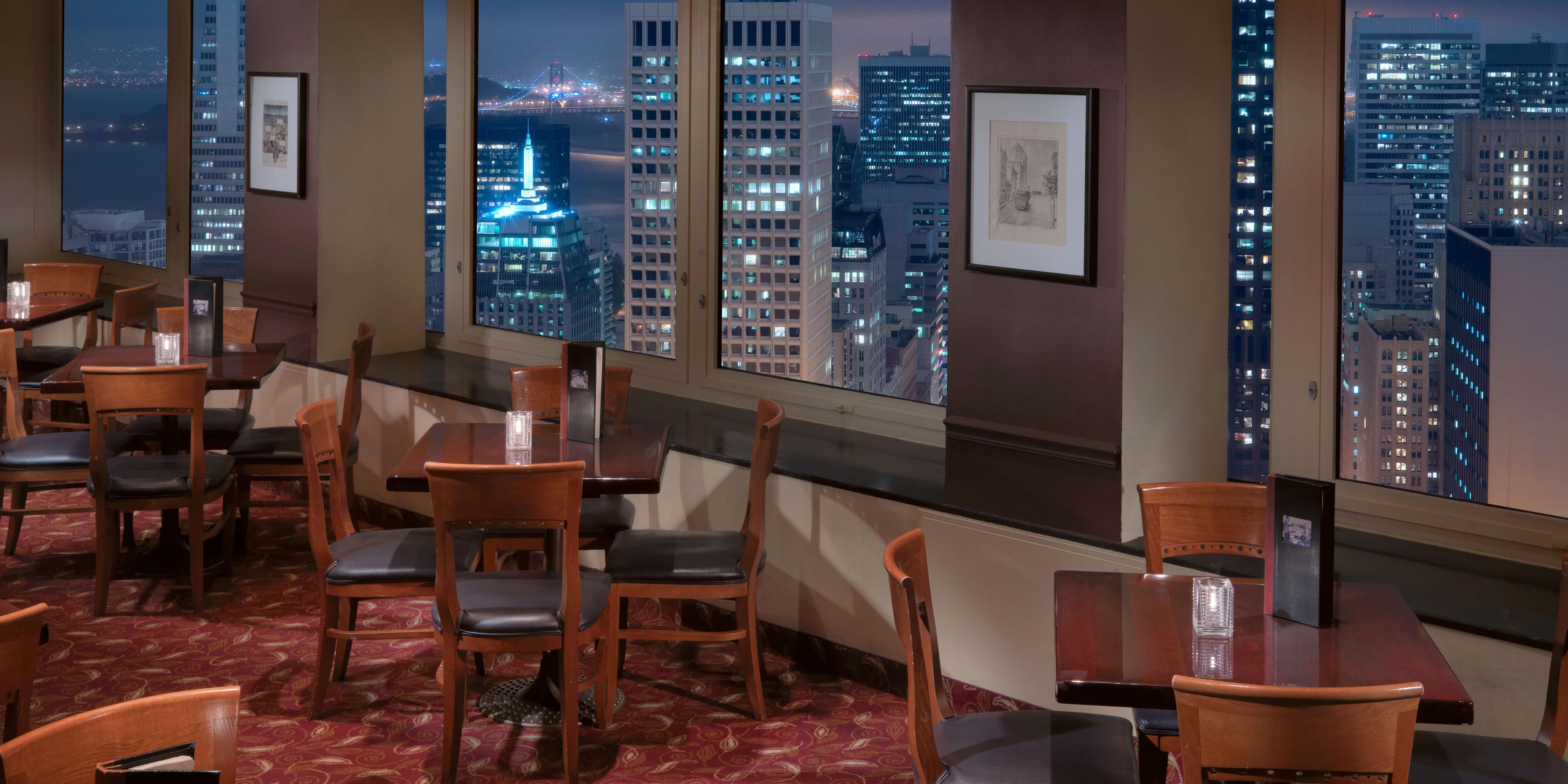 The Nob Hill Club provides a unique dining setting and delectable modern American fare. Top of the Mark affords incredible views and delicious appetizers and cocktails. Room Service is offered daily.