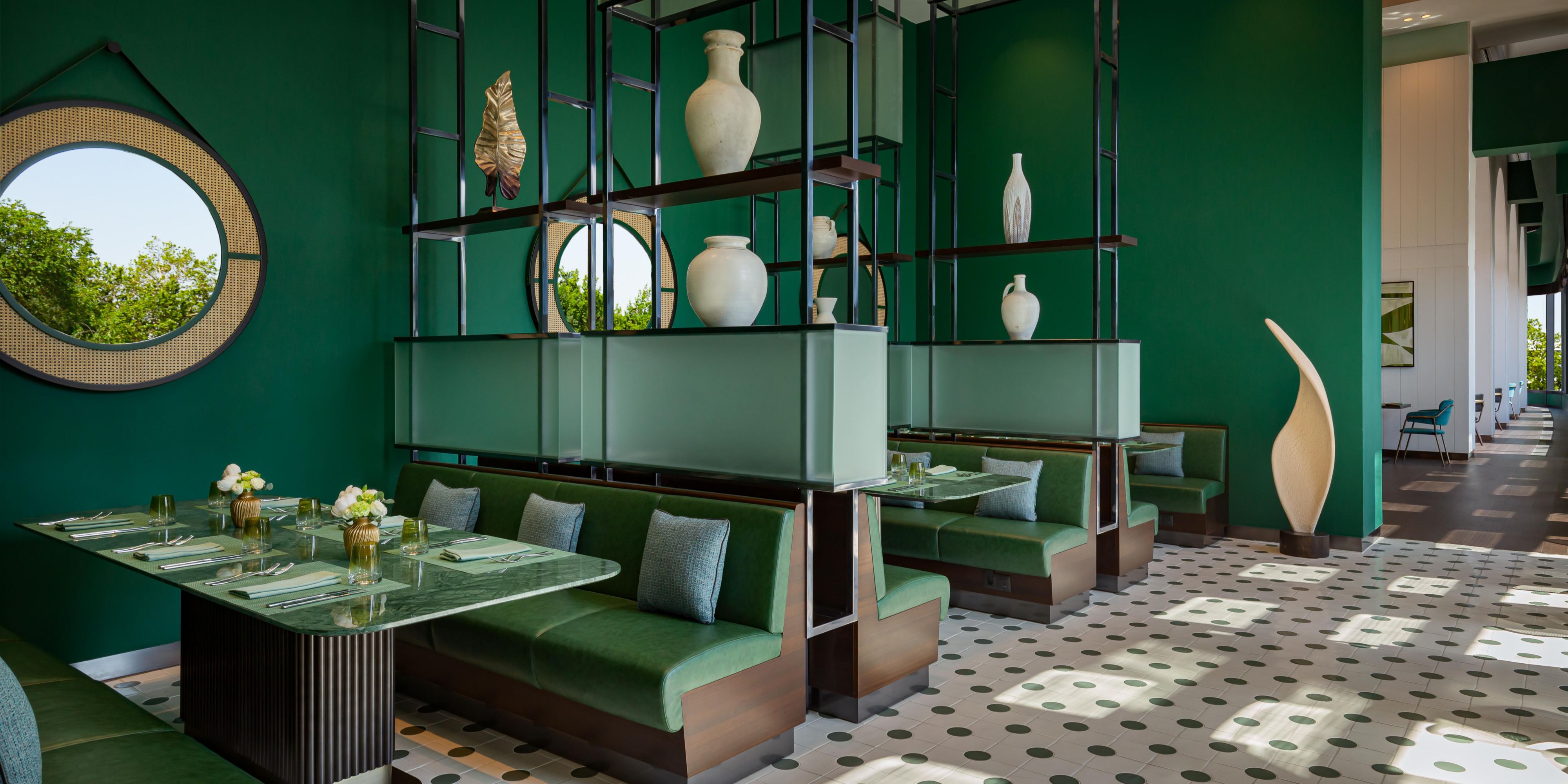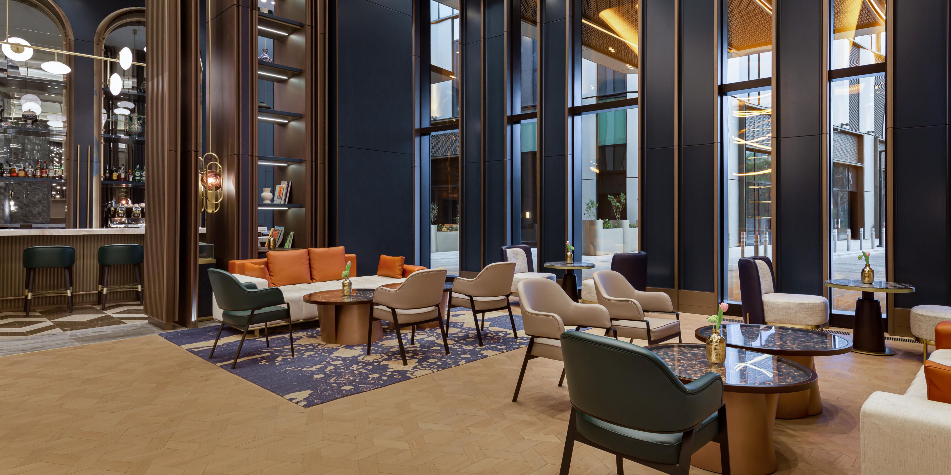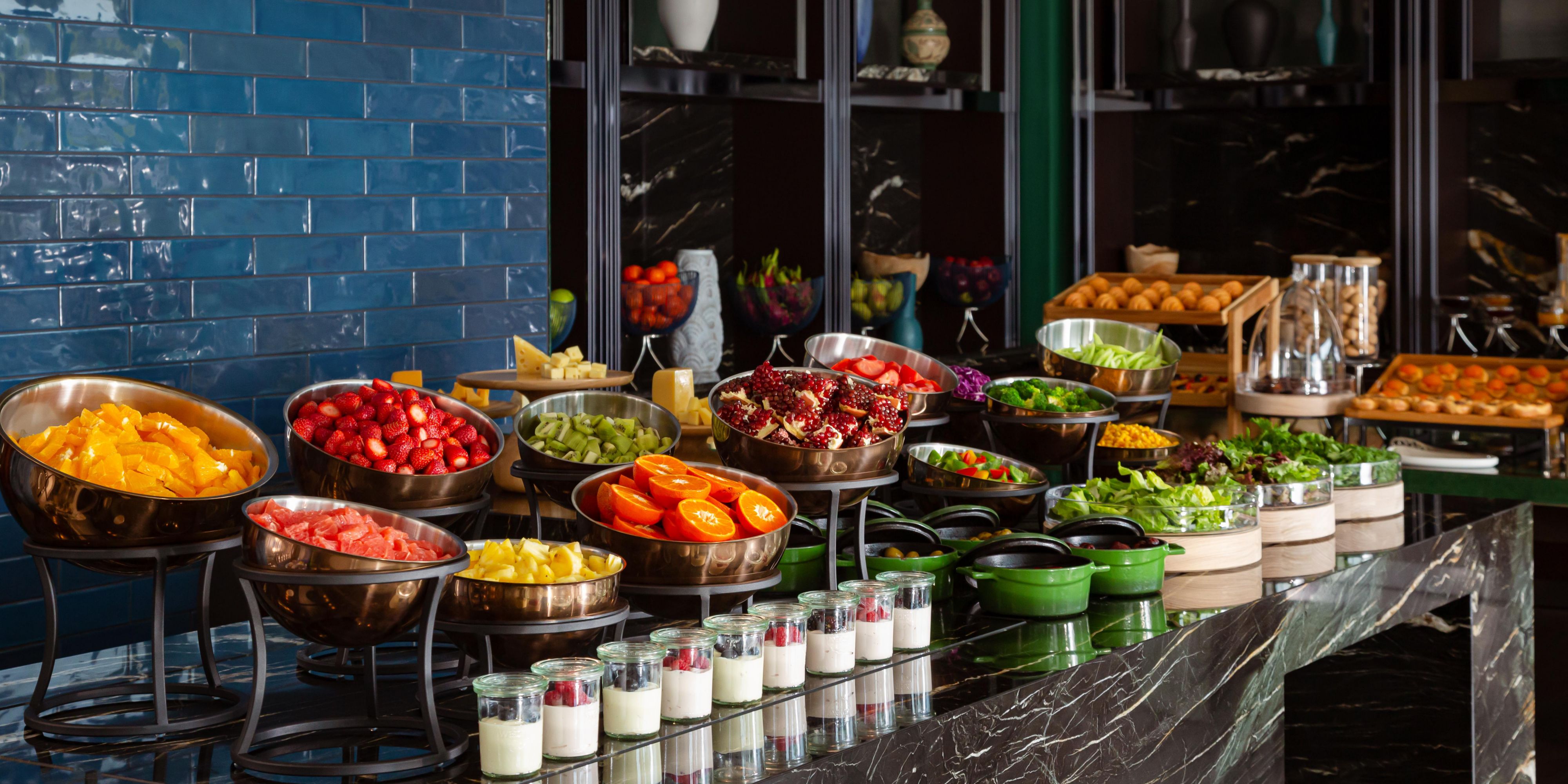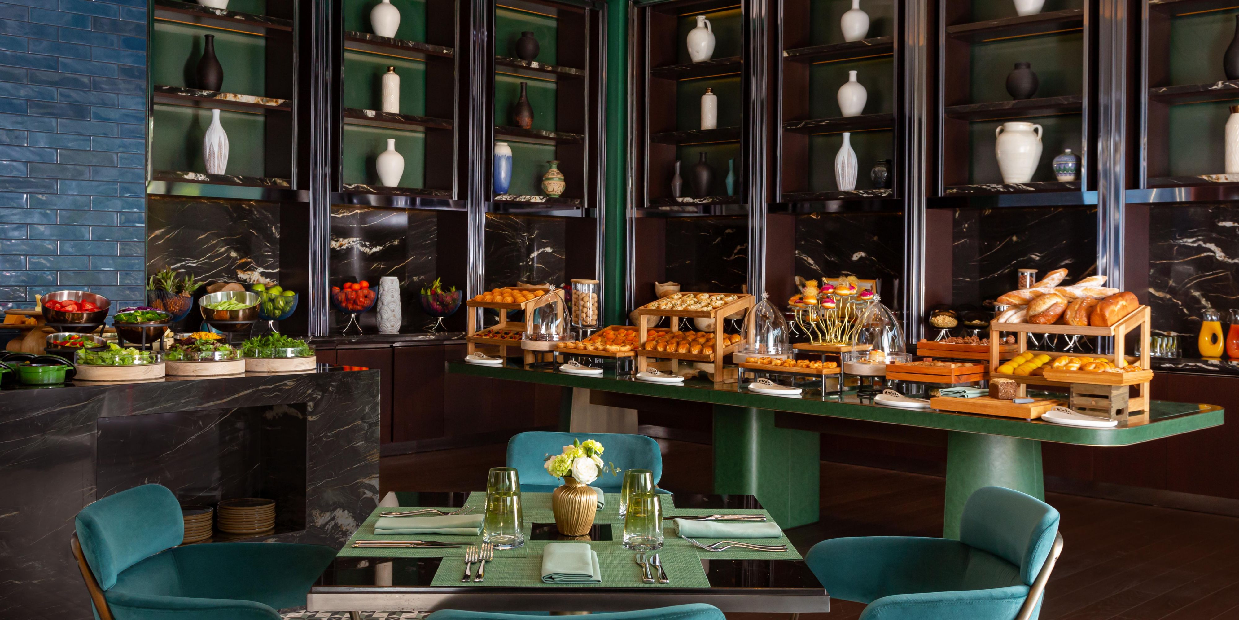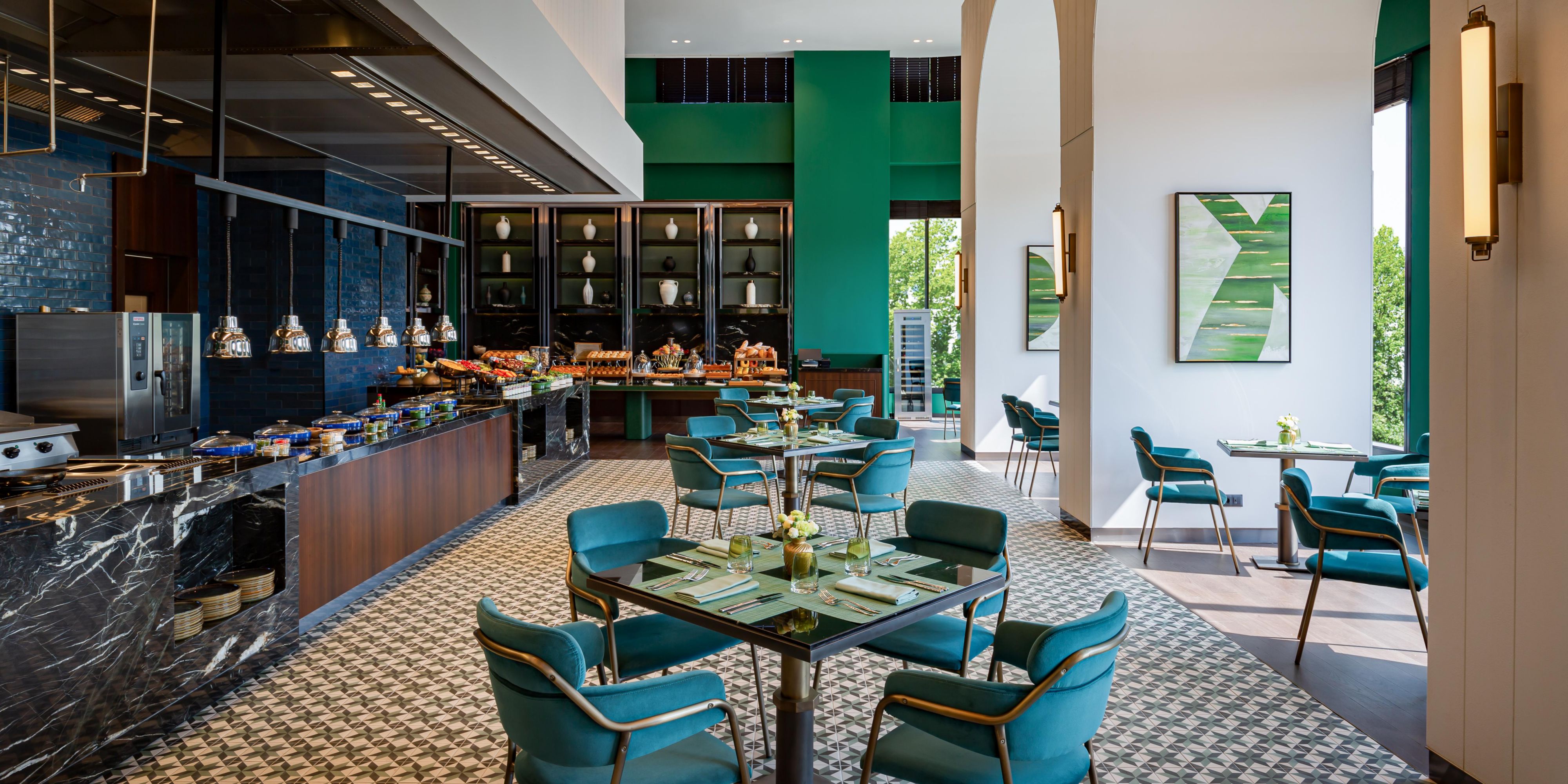 An immersive destination inspired by the landscape, culture and flavors of Central Asia. Featuring brilliant emerald interior, wide panoramic windows and showcasing an open kitchen and bar, No'mad offers dining from early morning till late night. The scrumptious breakfast buffet is served from 06:30 to 10:30 am on weekdays and from 06:30 to 11:00 am on weekends. For lunch and dinner, the restaurant offers the best of international and Mediterranean cuisine.