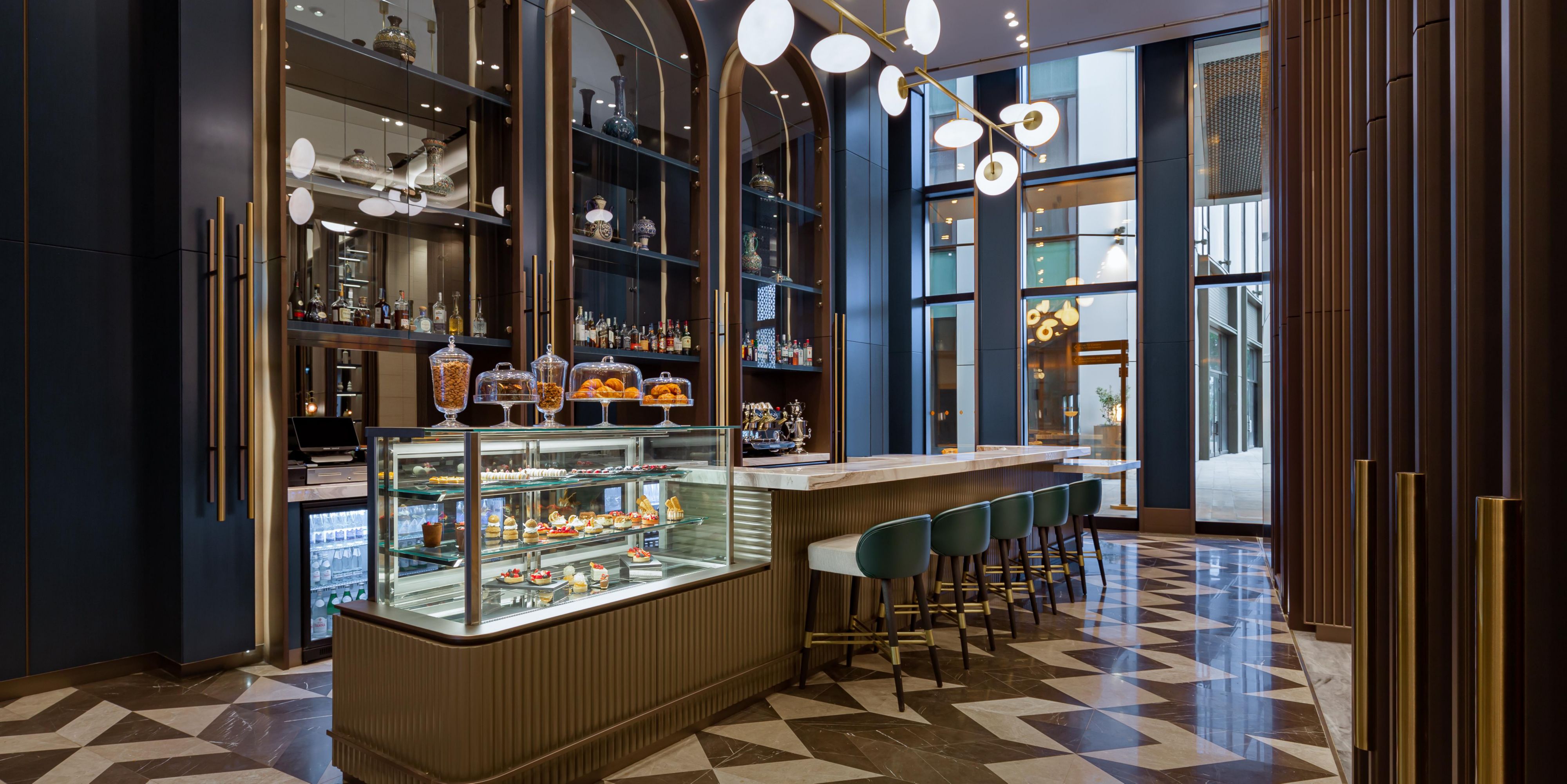 Decorated in elegant shades of grey and dark blue, Chach Lobby Lounge is the ideal place for coffee made from your own choice and patisserie masterpieces.