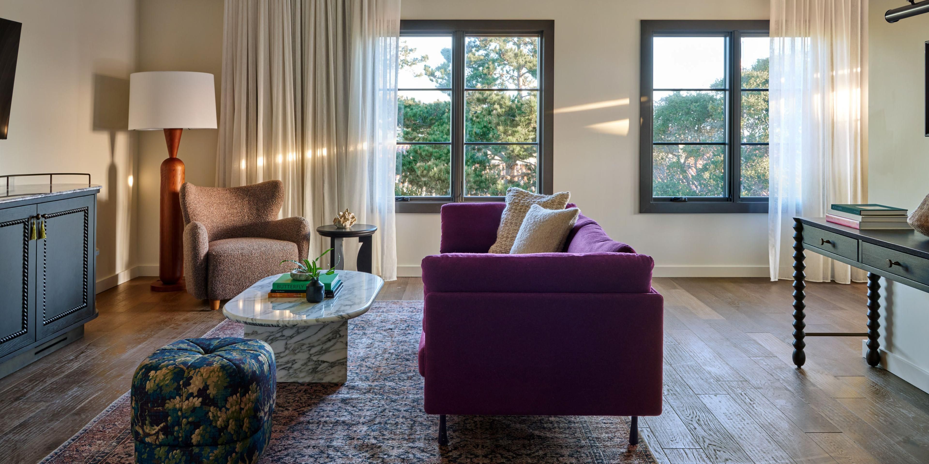 Each guest room at Kimpton Mirador is a sanctuary of warmth and refinement, designed to reflect the soulful elegance of the Monterey Peninsula. Inspired by the transformative beauty of Pacific Grove, rooms feature hand-troweled plaster walls, custom furnishings in rich earthy tones, and curated art from local artists. Guests can unwind among the fresh coastal air in one of our many rooms with a private balcony, or warm up in front of a fireplace in select suites and premium rooms.
