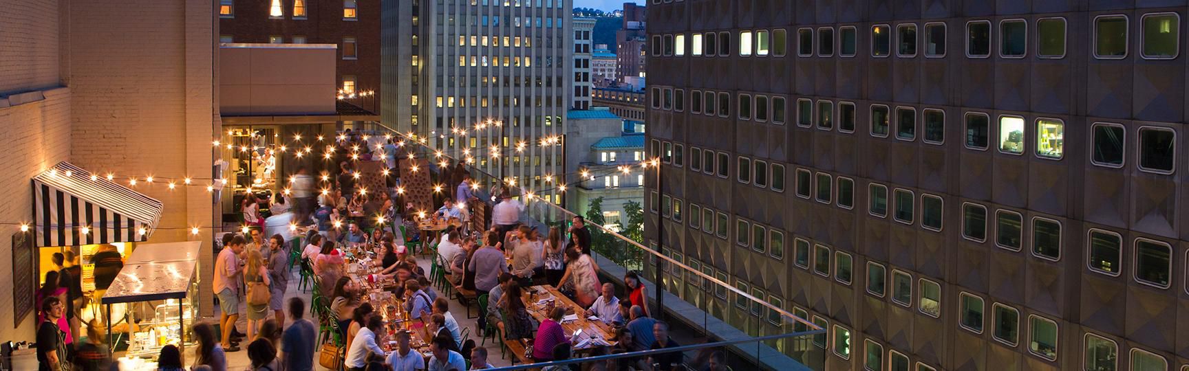 Perched 9 stories above William Penn Place, our open air, rooftop Biergarten is the perfect post work and weekend place to cheers good friends and good times. The Biergarten features a tantalizing menu of seasonal cocktails, created by our own bar team, and an ever changing beer list that encompasses many different styles. With your drink in hand, enjoy one of our small bite menu items for a relaxing and fun evening outside.