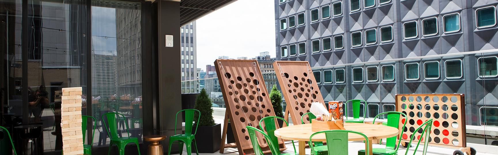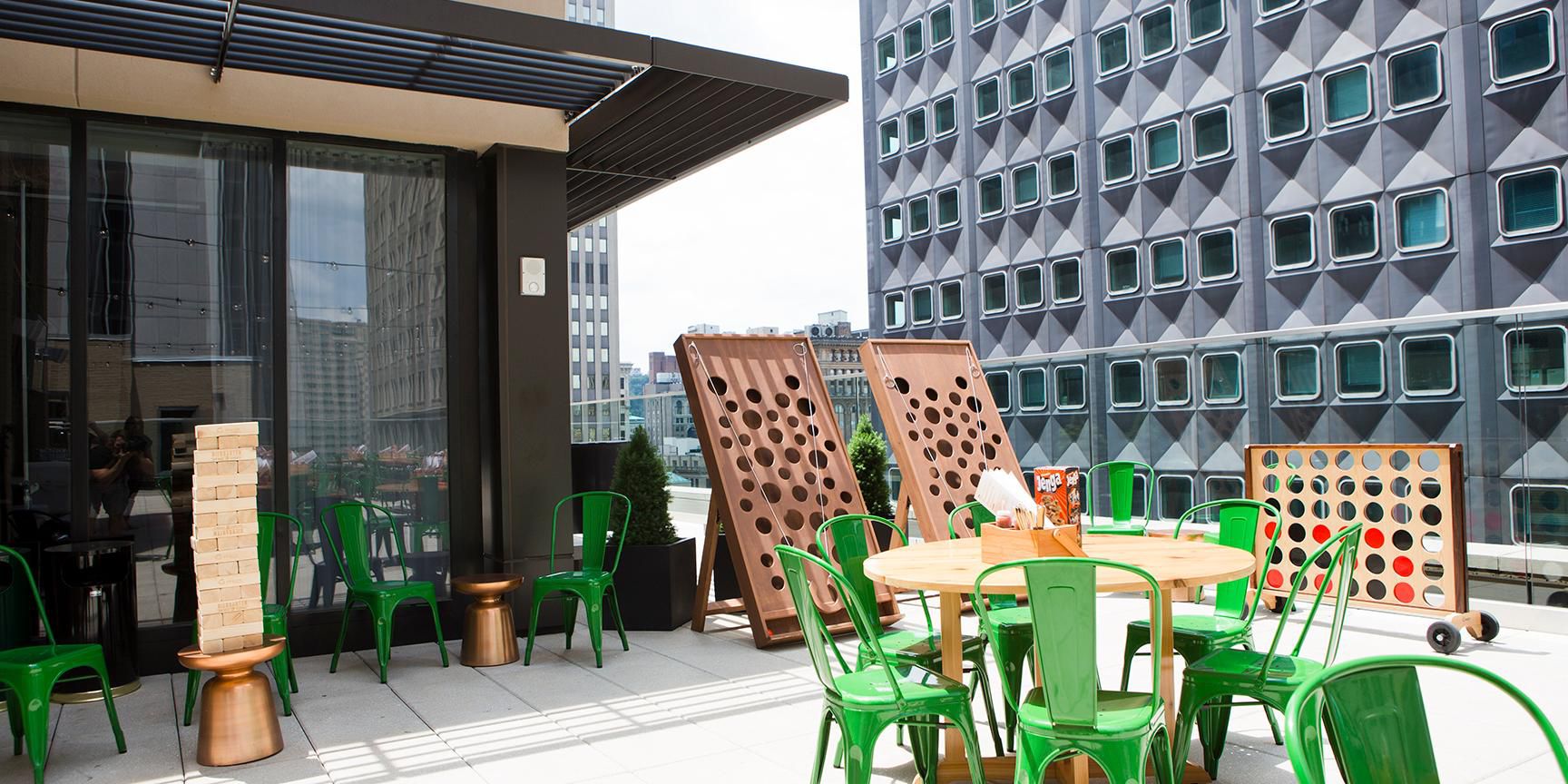 Perched 9 stories up, our open air rooftop Biergarten is the perfect post-work and weekend place to cheers good friends and good times. Prost!