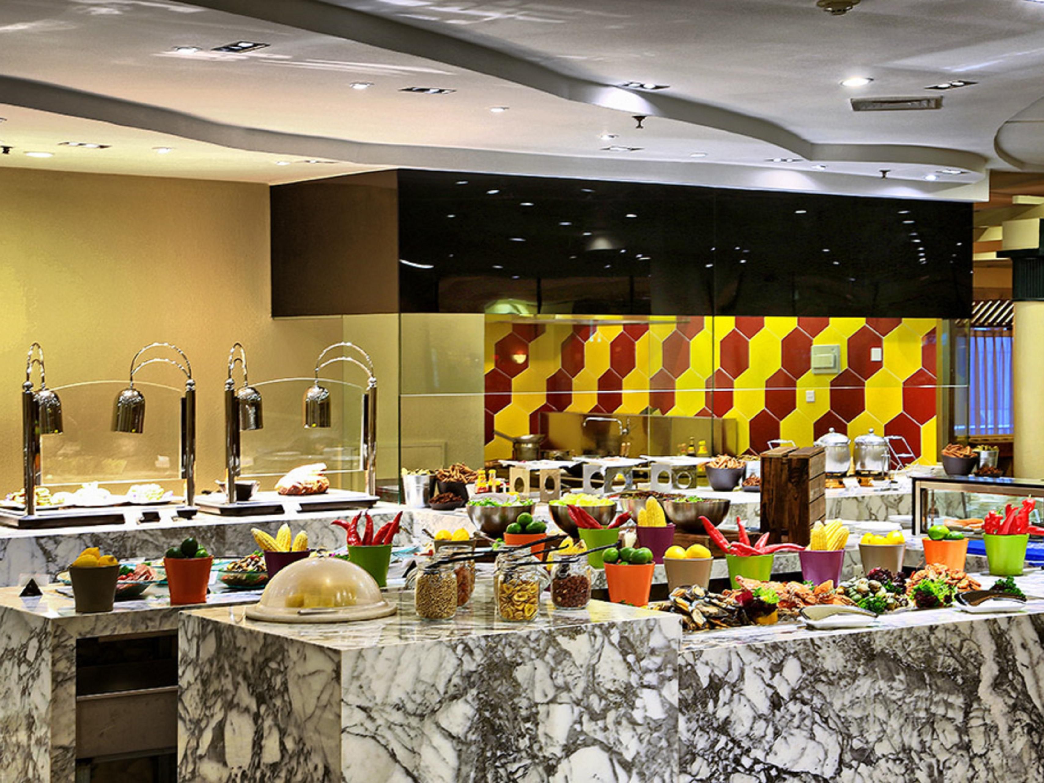 每日二十四小时营业。 提供早、中、晚自助餐,特选欧、亚风味菜肴。 早餐1.2m(不含)以下儿童免费,1.2m-1.5m儿童58元/位,1.5m以上98元/位