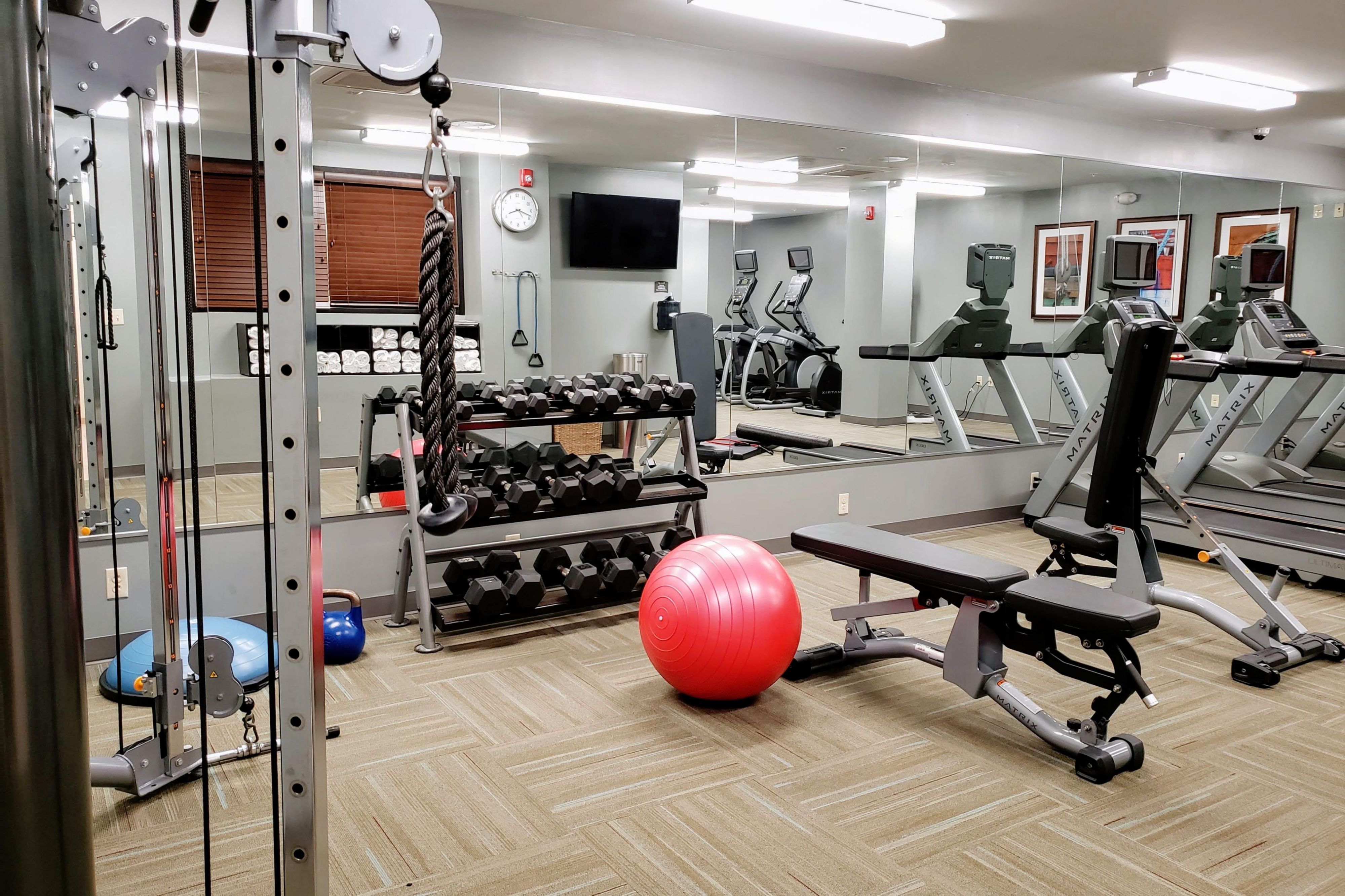 Multi-function Machine and free weights are available. 3 treadmills, 2 upright bikes & 2 elliptical machines. Stretching area and cardio.