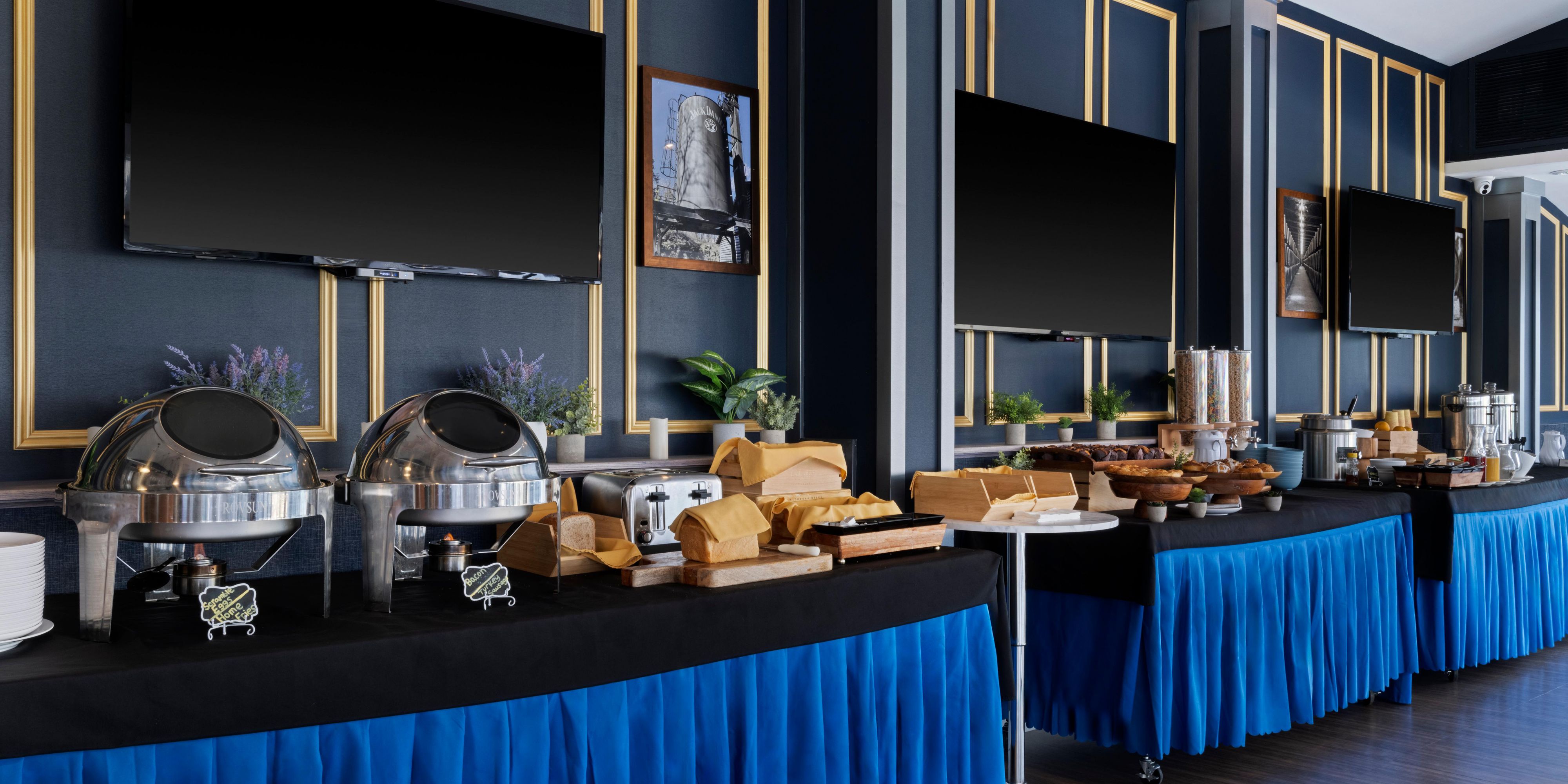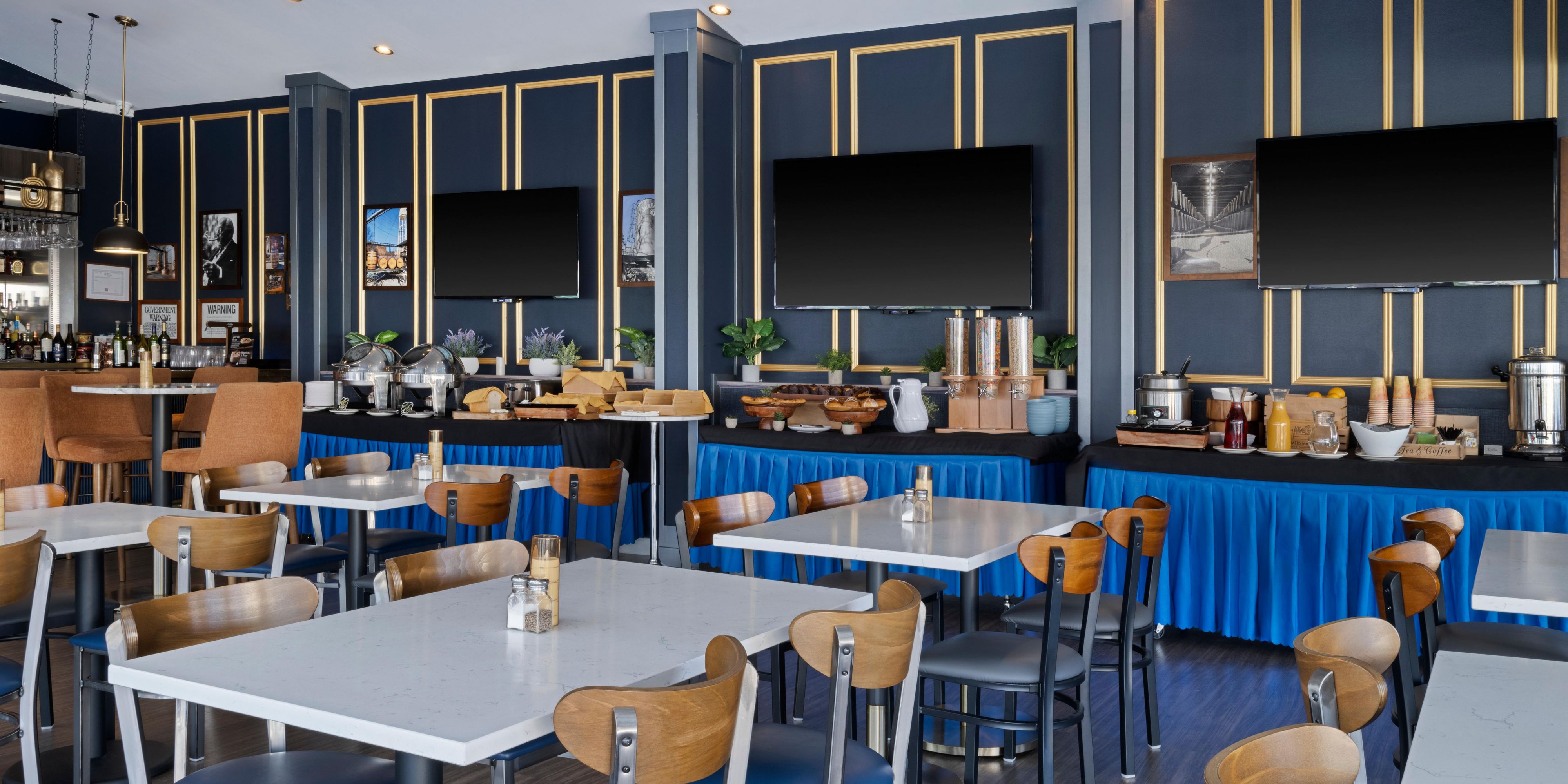 Fuel your day with a traditional breakfast buffet featuring a variety of hot and cold options. Savor classics like scrambled eggs, bacon, turkey sausage, breakfast potatoes, toast, and oatmeal. For those who prefer lighter fare, we offer bagels, muffins, Danish, fresh fruits, and yogurt. Take in the incredible city views while sipping your morning coffee. Later in the day, enjoy a unique selection of tapas and a variety of beverages and cocktails.