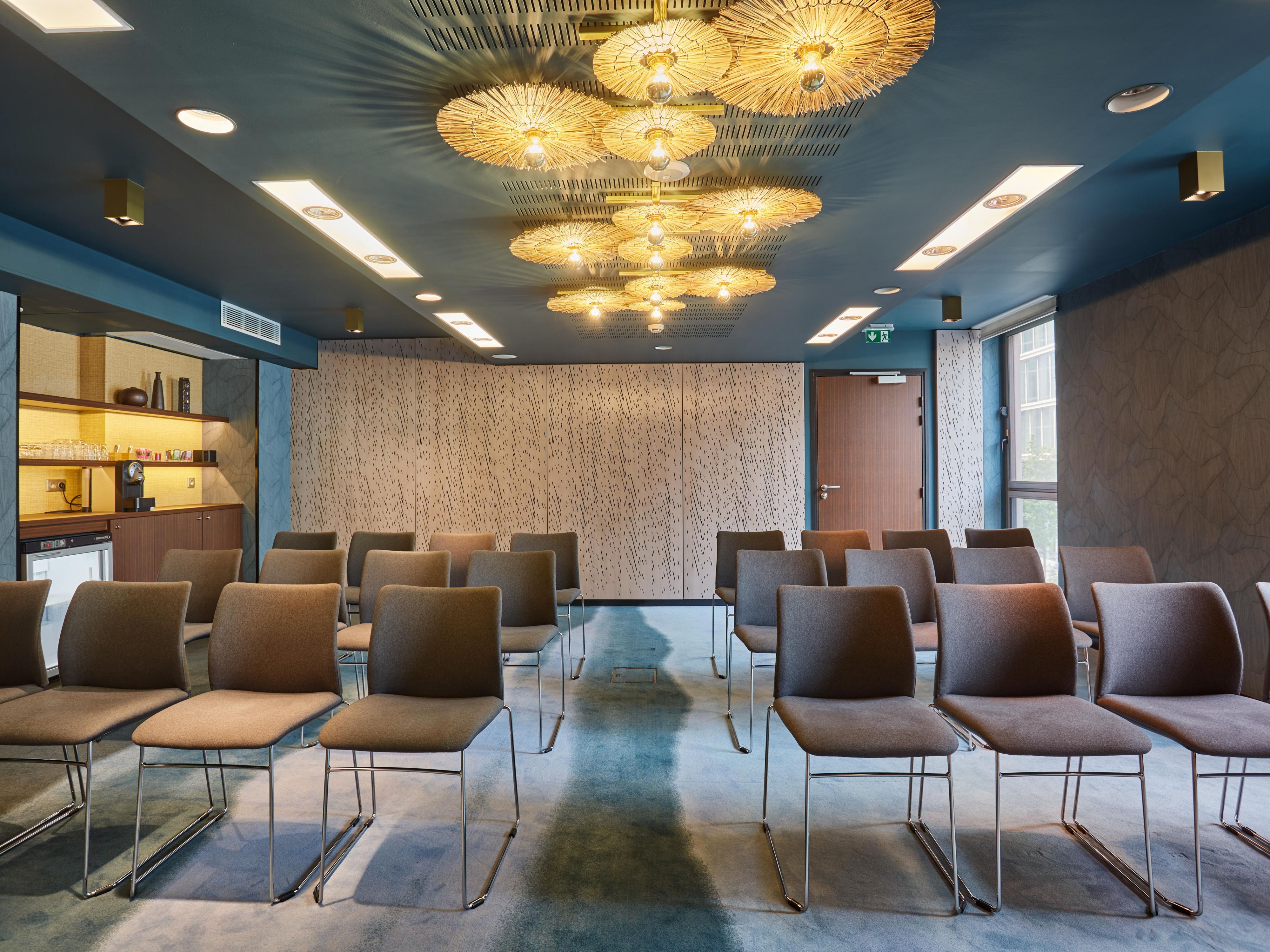 Spacious 143sqm meeting room, equipped with screen & HD projector. Divisible into four 35sqm rooms, great addition to our Safran plenary room and perfect for breakout sessions. Adjacent coffee break area. This meeting room is located on Floor -1.