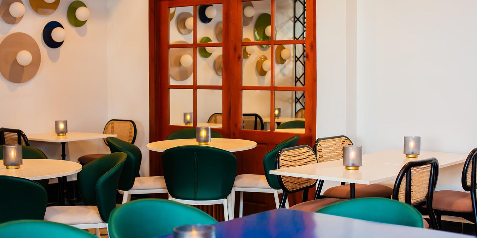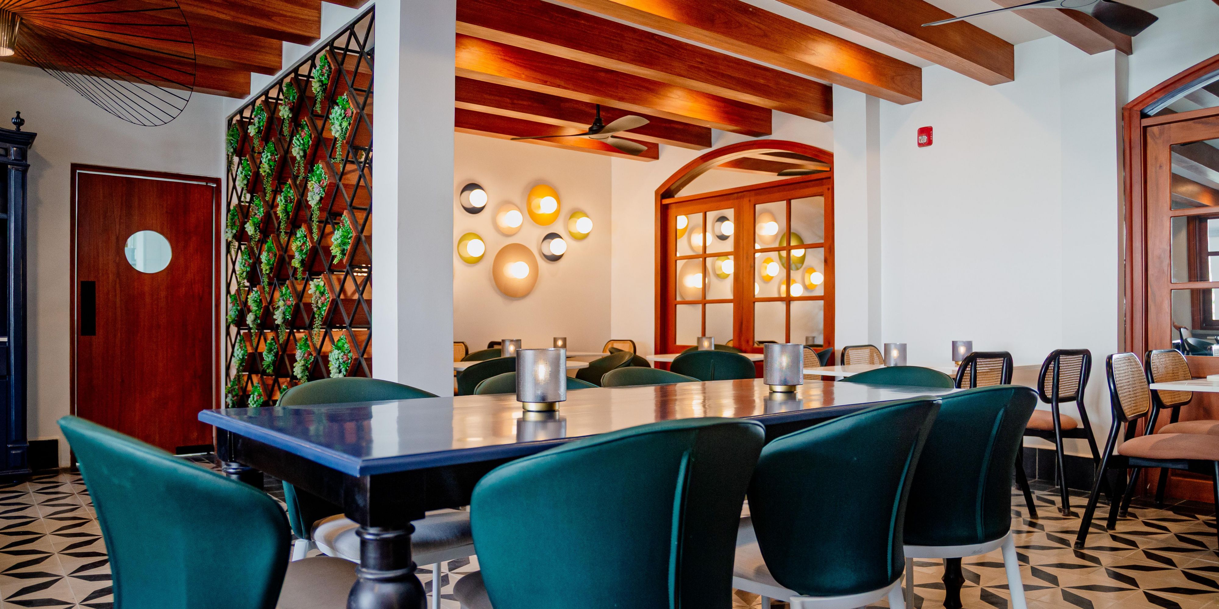 Restaurant serving local and international fusion food, decorated with architectural elements in precious woods and waiter service.
